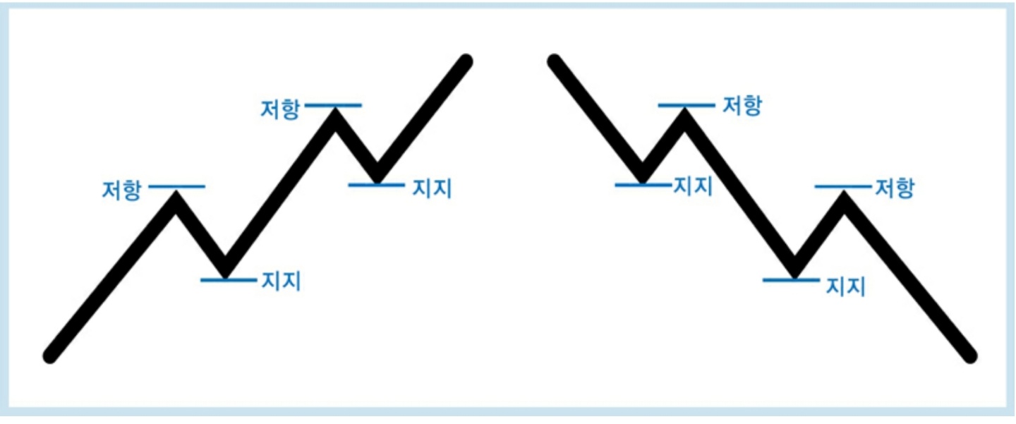 또한 주가가 하락할 때도 시장가격이 어떤 일정한 수준 근처에 접근하면, 더 이상의 하락세를 멈추고 횡보 내지 제한적인 움직임을 보이는 등 움직임이 더디어지는 것을 볼 수 있다. 바로 이러한 현상이 기술적 분석기법의 중요한 요소인 저항선과 지지선이다.