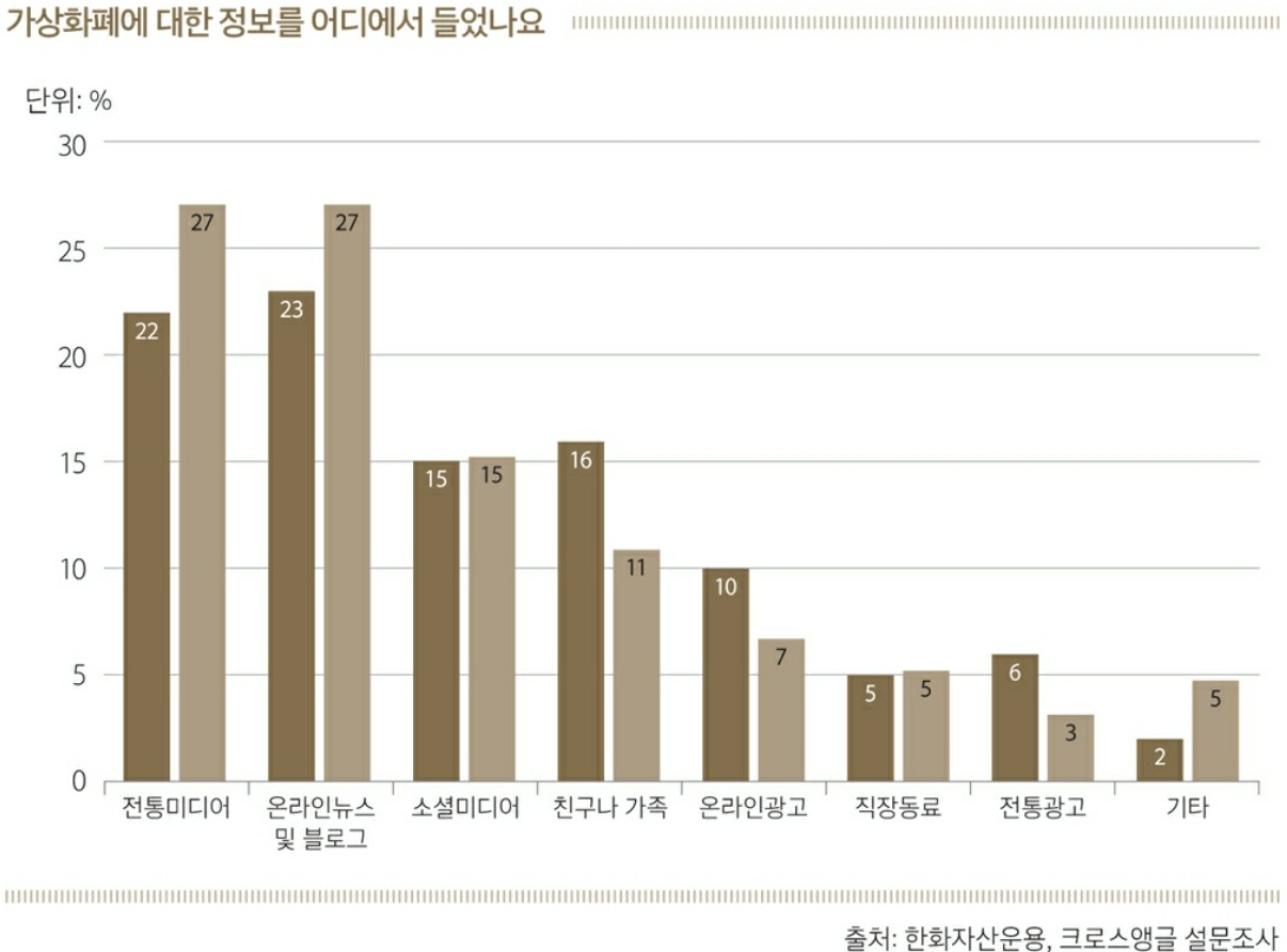 실제 2021년 5월 31일부터 일주일간 한화자산운용과 크로스앵글이 전국 성인 남녀 537명을 대상으로 실시한 디지털자산 투자실태 설문조사에서 디지털자산 관련 정보를 얻는 통로(복수 선택)로 ‘미디어 뉴스 및 유튜브’를 꼽은 투자자가 57.7%로 가장 많았고, ‘주변 지인’이 51.6%, ‘텔레그램과 오픈 카톡방, 트위터 등 사회관계망서비스(SNS)’가 48.4% 순이었습니다. 주식과 달리 ‘금융회사’라는 공식적인 채널로부터 투자 정보를 얻는다는 투자자는 고작 31.5%에 그쳤습니다.